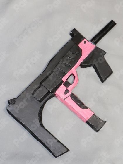 造形ボードで自作された、ボリューム仕様の模造銃です。縦約28cm横約44cm幅約2.5cmで、ボード製のため軽量です。実用性はありません。模様は手書きで再現されており色ムラなどが見られます。ボードを貼り合わせて作られており、貼り合わせに剥がれや側面に凹凸が見られます。