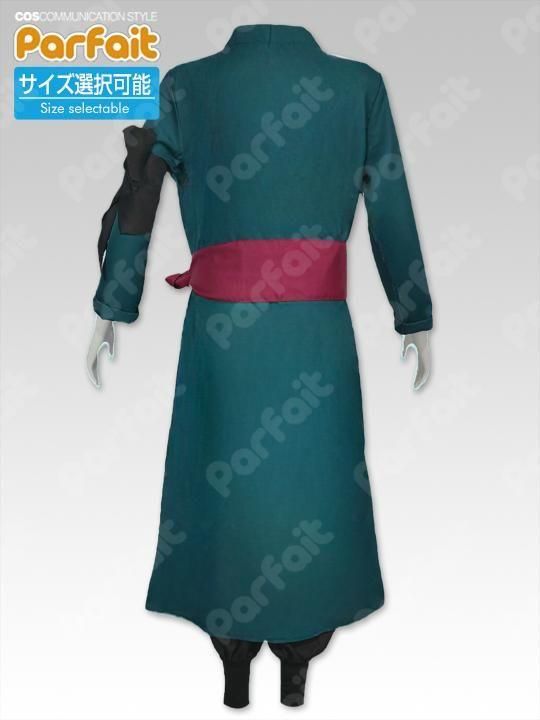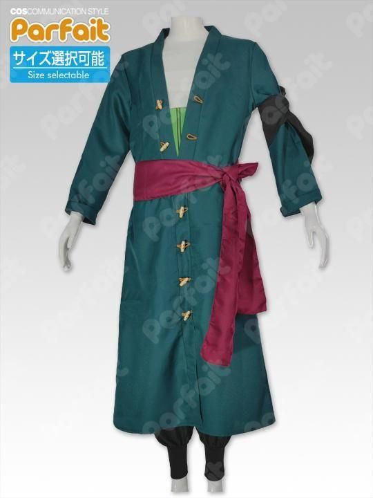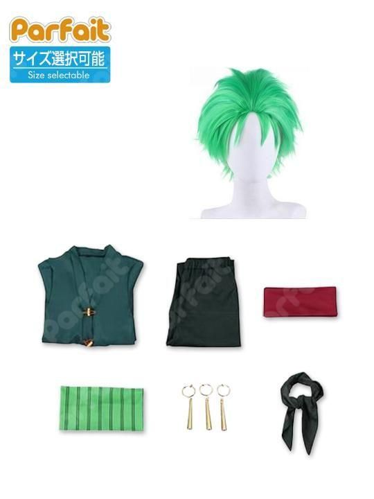 ウィッグが付属したゾロ仕様の2年後衣装です。主にポリエステルで作られています。ズボンはゴムウエストです。