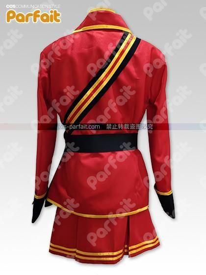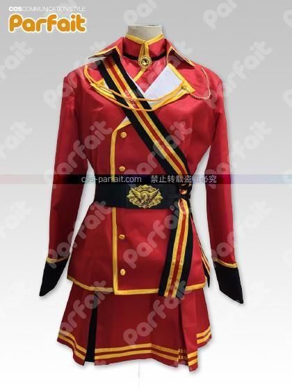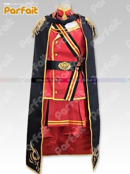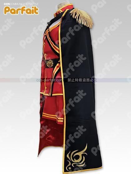 赤を基調とした中世の軍服風の衣装で、マントの背面の模様はラバープリントで制作しています(そのため衣類乾燥機には対応していません)。