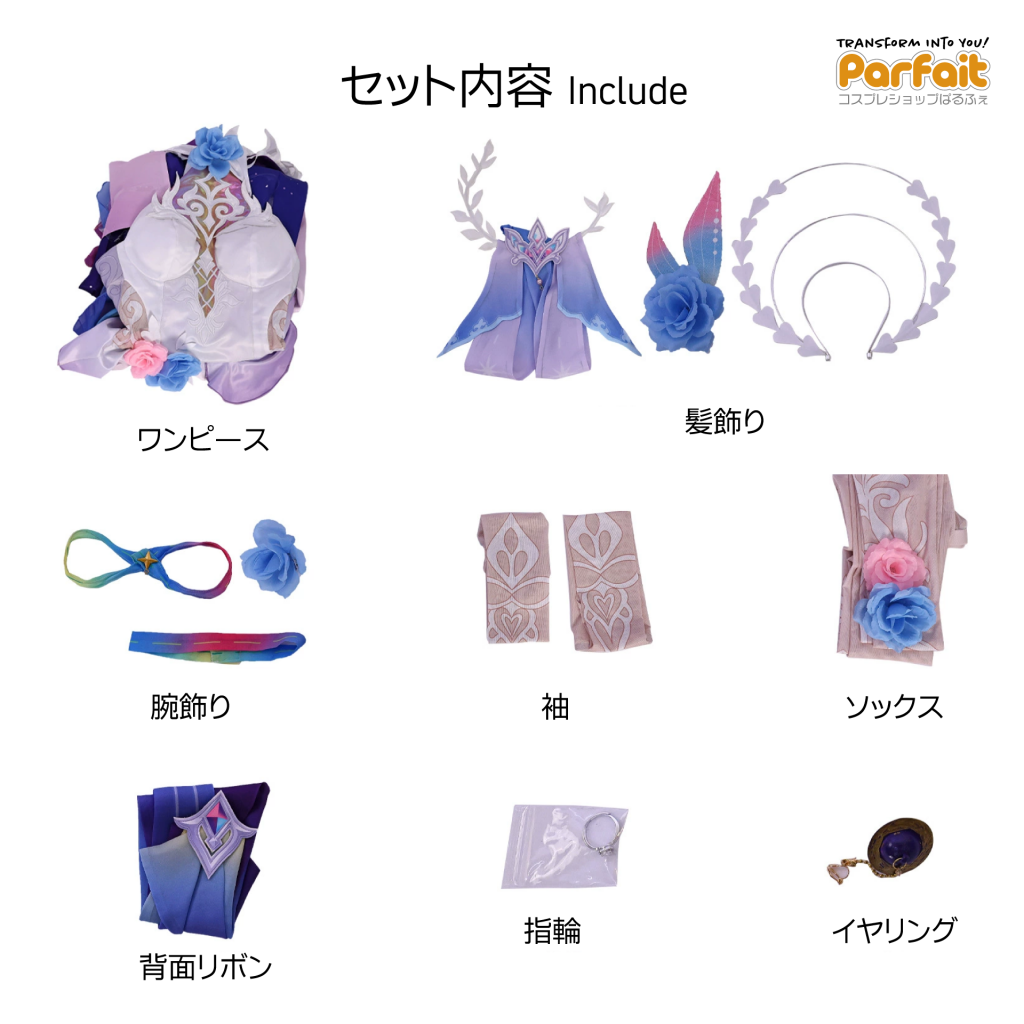 【セット内容】ワンピース、髪飾り、腕飾り、袖、ソックス、背面リボン、指輪、イヤリング