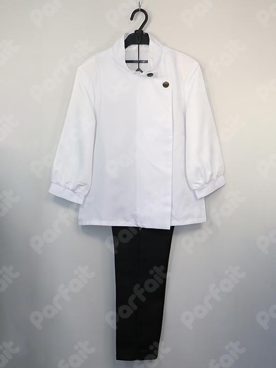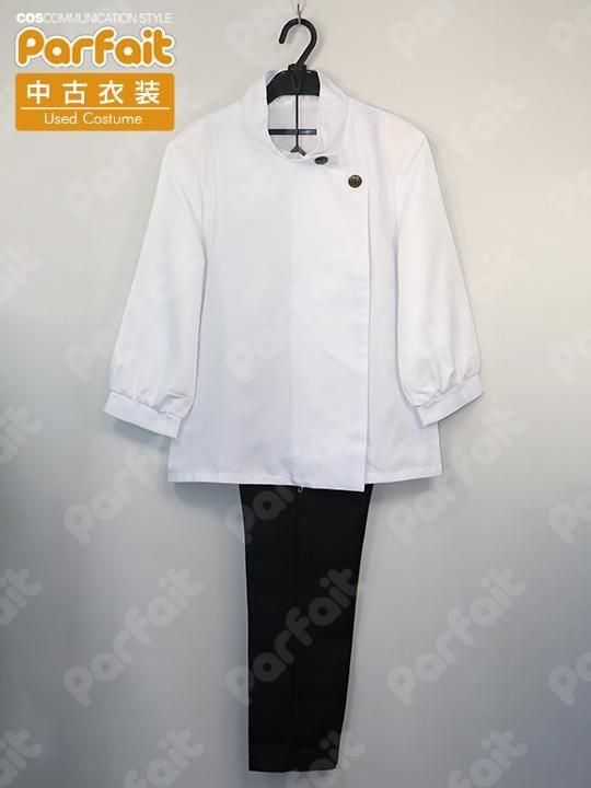 白の制服衣装です。上着はSサイズ表記でバスト約94cm、ズボンはLサイズ表記でウエスト約78cmでL-XLサイズ相当です。上着はファスナーとボタンで着脱でき、ボタンの形状は特装されています。上着の襟元や背面などに糸引きが見られます。ズボンのポケットには実用性があります。
