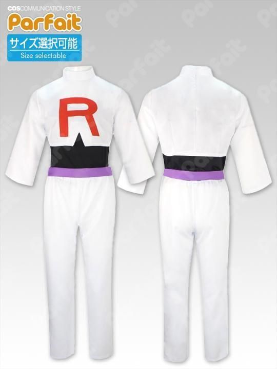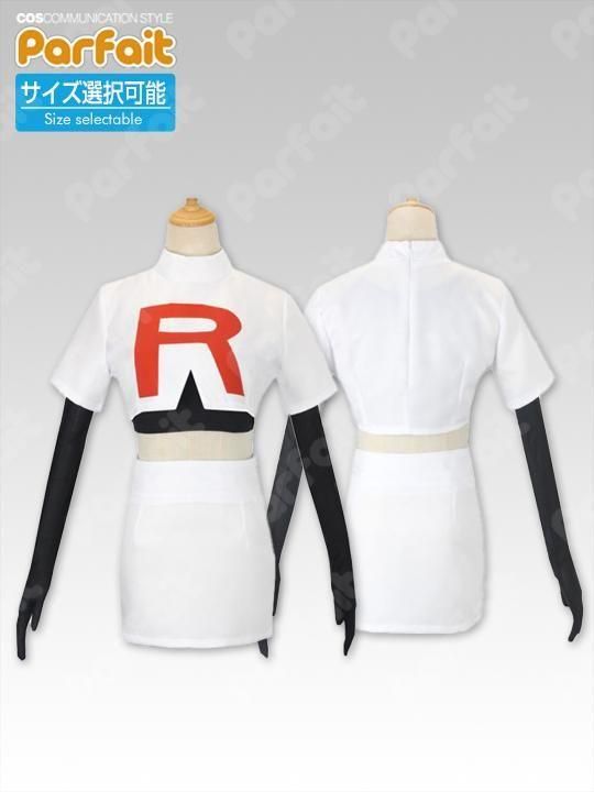 白のロケット団制服衣装です。薄手のポリエステル生地で作られており、上着の模様はプリントです。