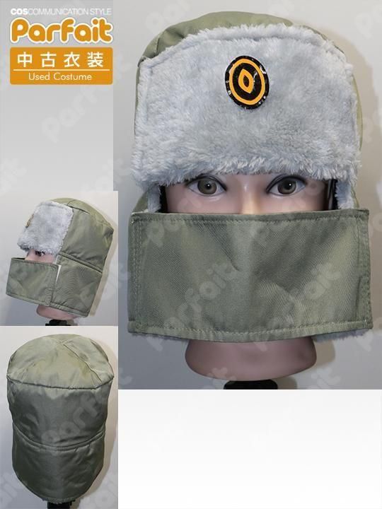 比較的状態の良い制服衣装です。コートは厚手のフリース生地が使われておりしっかりとしています。フードマフラーの模様は生地縫い付けで再現されています。手袋やベルトは合皮製で状態は比較的良好です。(2025/11時点)帽子は正面口元の布地が取れる仕様です。