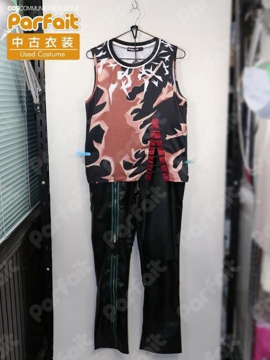 COMICLAND製。天城燐音仕様のシャッフルユニット衣装です。上着の右チェーン飾りがありません。タンクトップはMサイズ表記でバスト約90cmです。上着の模様は刺繍や刺繍バッジで再現されています。ズボンにはダメージ加工があります。上着やズボン・ベルト類は合皮製で状態は比較的良好です。白ベルトに一部赤色移りが見られます。(2025/11時点)帽子の飾りはアクリルバッジです。手袋のスタッズが一つ欠品しています。