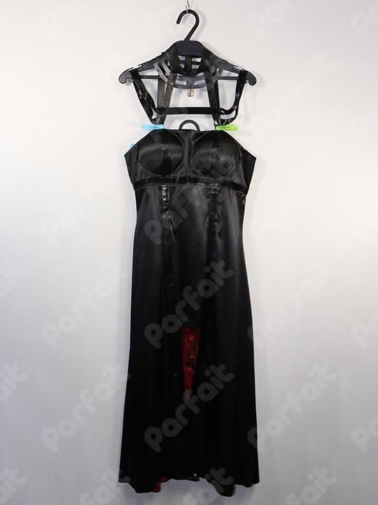 三分妄想製。いばら姫仕様の黒ドレス衣装です。手袋がなく、靴下は仕様で付属していません。柔らかくマットな光沢のある生地を使用しています。裏地はバラ柄の赤レース生地です。ワンピースの肩ベルトや太ももベルトは合皮製で首ベルトに若干折れ跡があります。片方の太ももベルトにちぎれた箇所があります。(2025/12時点、通常の条件、および生地破損を事由とする返品は不可)