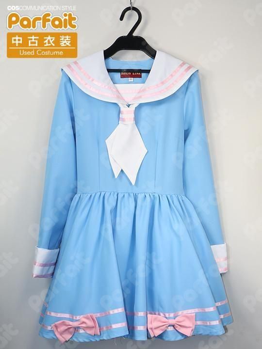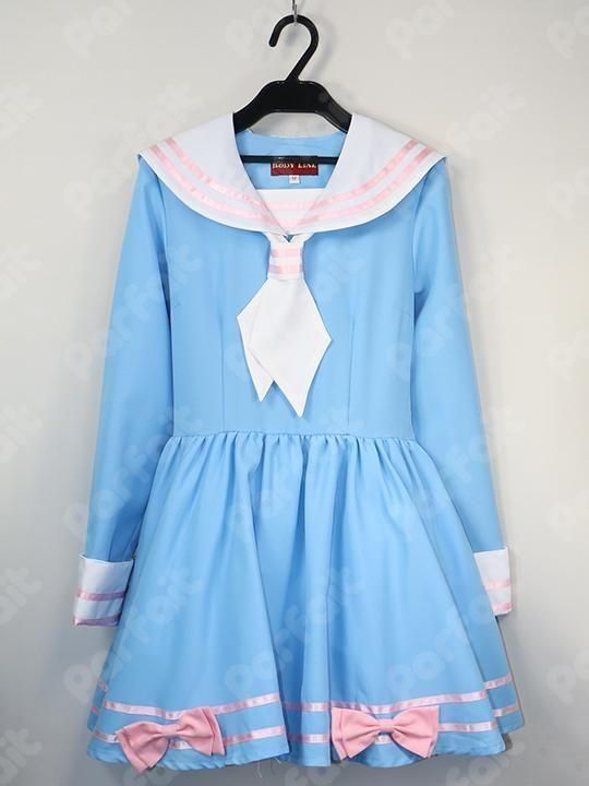 BODYLINE製。ロリータ風のセーラー服風ワンピースです。スカートは内スカート付きでボリュームが出るつくりです。腰部に白の帯紐が縫い付けられています。右脇にほつれの修繕跡があります。